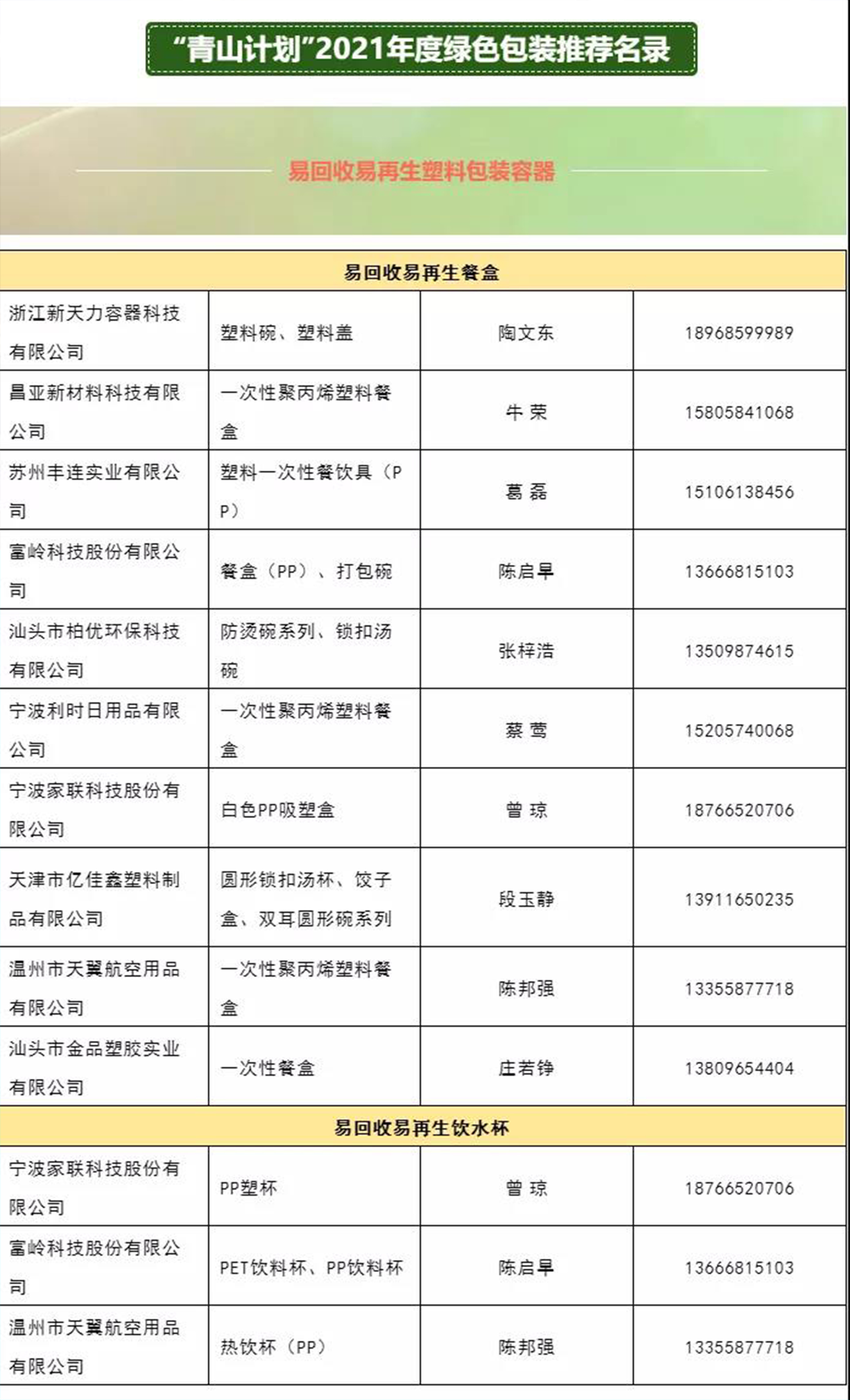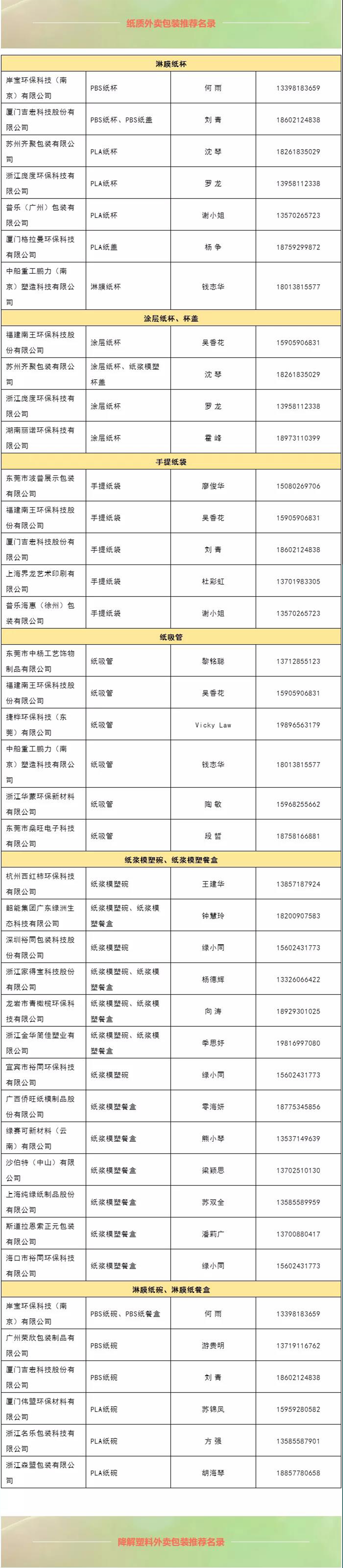 名录分为“ 易回收易再生塑料包装容器”、“纸质外卖包装” 、“降解塑料外卖包装” 三大类别,涵盖PLA、PBS、PBAT餐盒,纸杯,纸碗,吸管,纸浆模塑餐盒、PP餐盒等共计101家优质餐饮外卖包装供应商的161件环保产品,为广大餐饮外卖商户提供外卖环保包装解决方案,也为外卖行业绿色供应链建设提供支撑。
